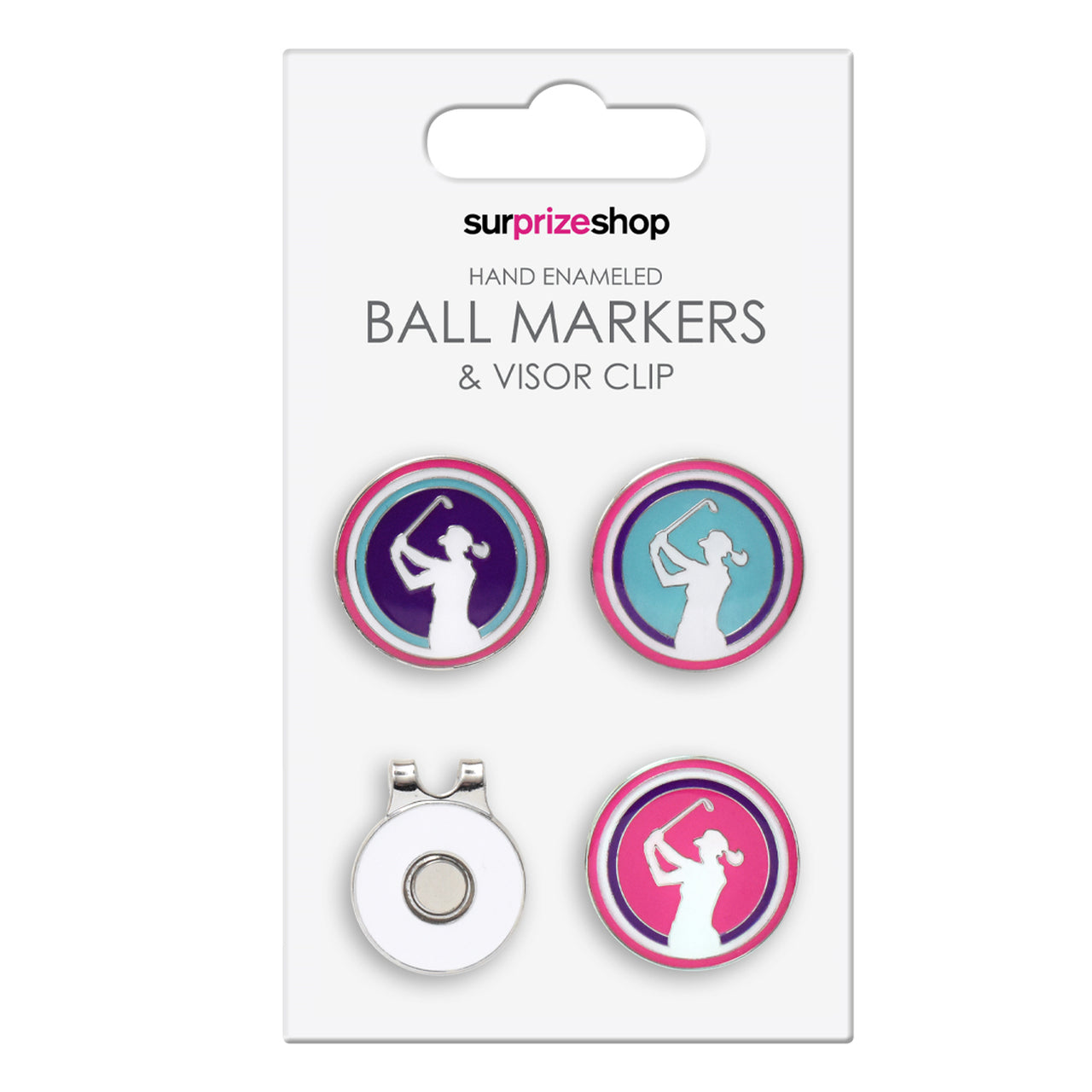 With 3 different types of lady golfer deisgn Ball Markers to choose form when playing. This Fun set of Ladies Golf Ball Markers make the perfect set for your golf game or makes a fun present for a friend.